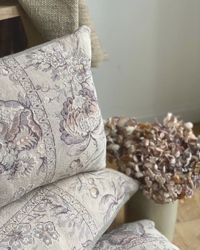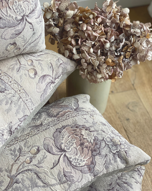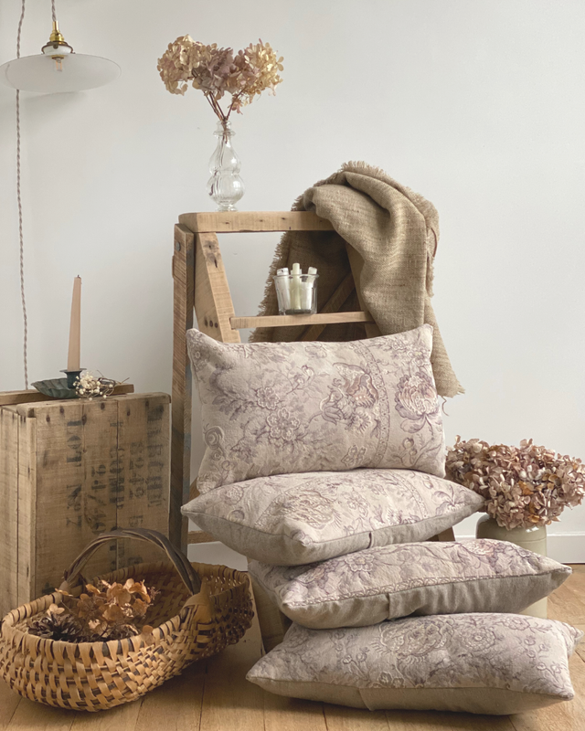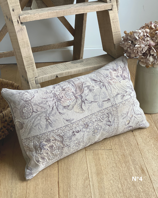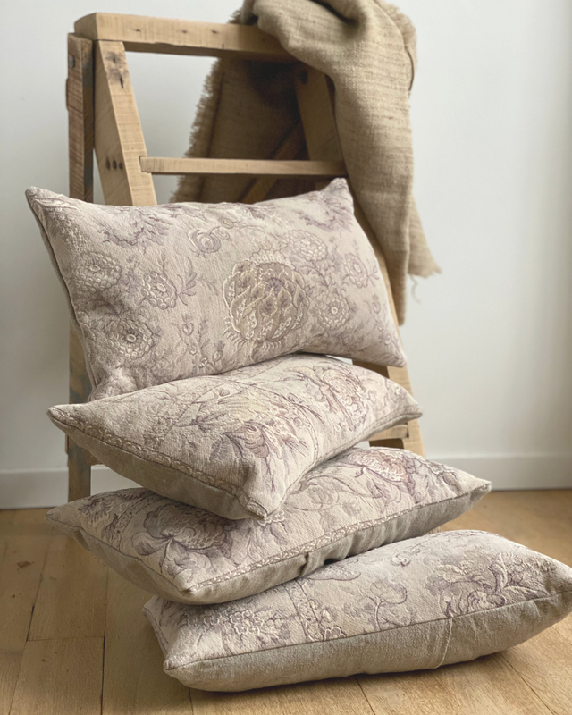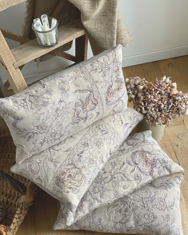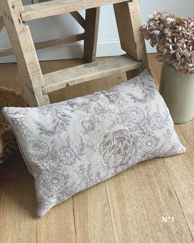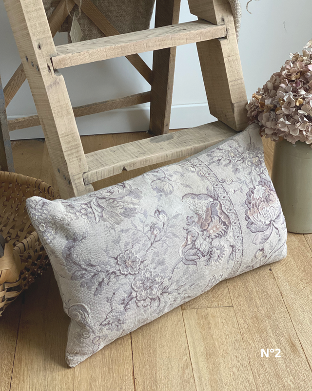 Ces coussins ont été confectionnés à partir d’un tissu ancien fleuri, soigneusement sélectionné pour ses motifs délicats et ses nuances douces.