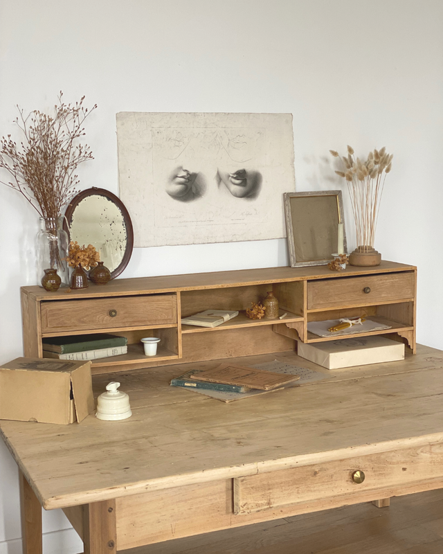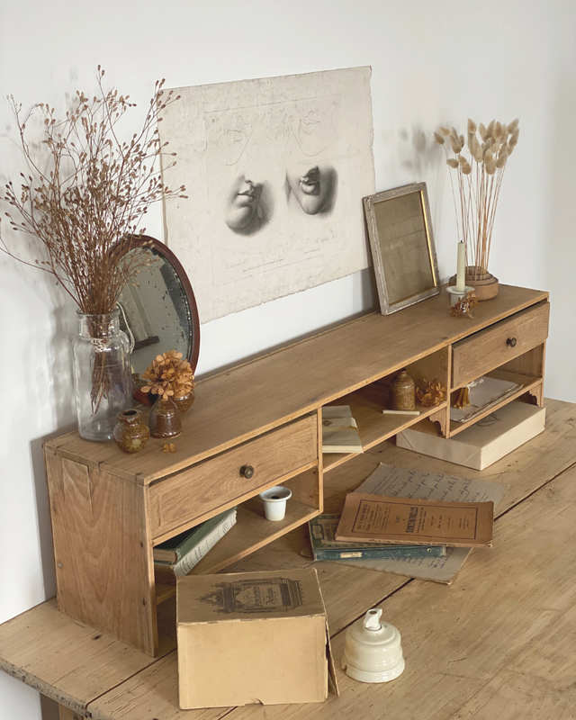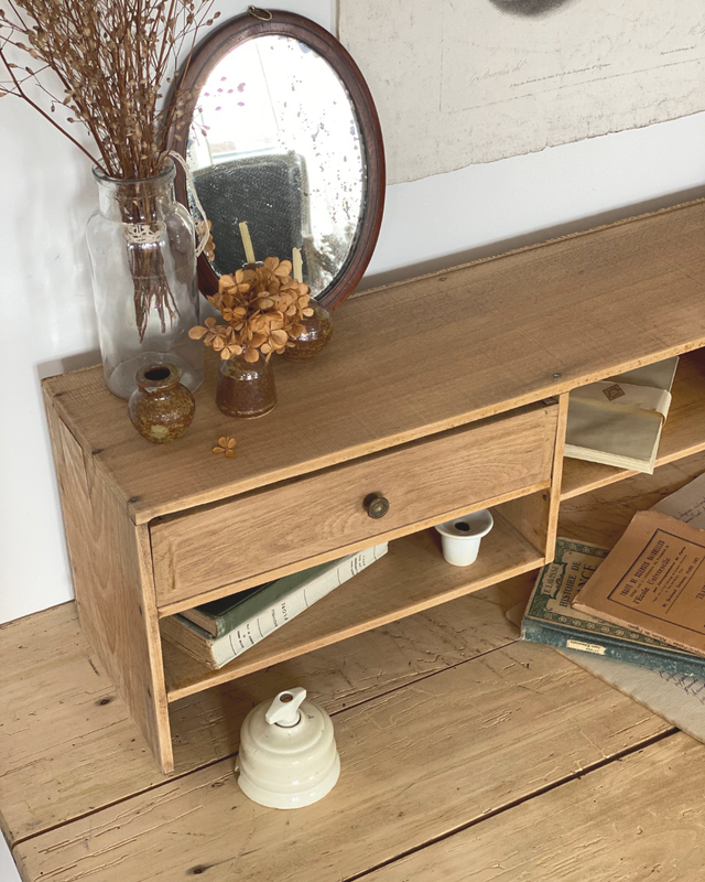 Le bois a conservé une jolie patine, qui donne envie de mettre en scène des trésors du quotidien.