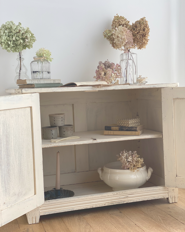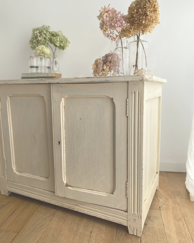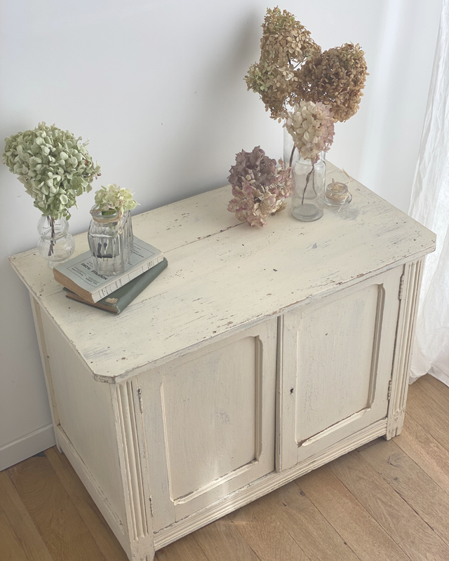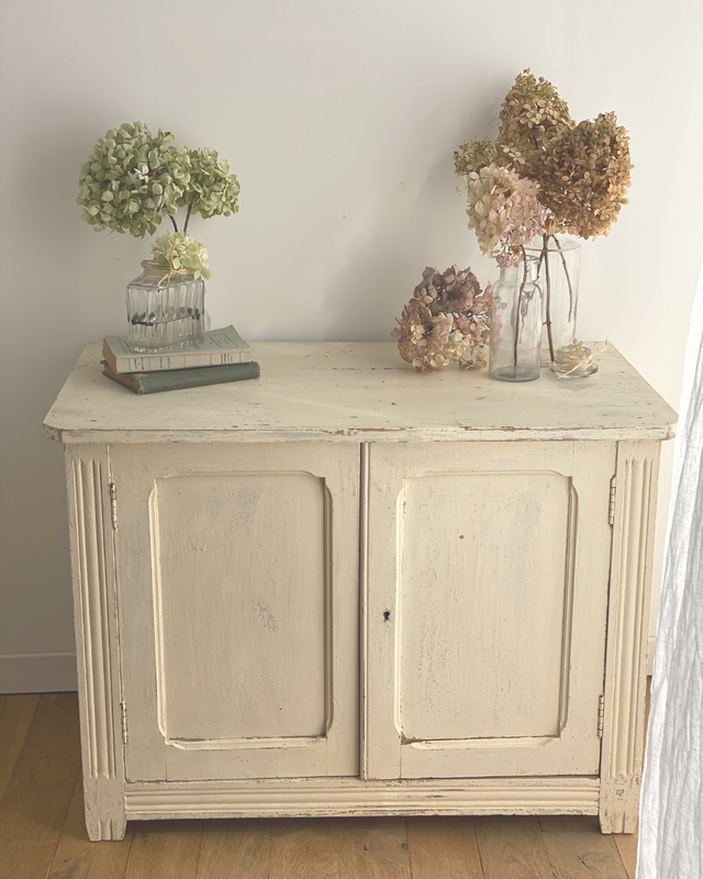 Sa patine d’origine s’accorde à merveille avec les teintes douces des hortensias du jardin 🌱